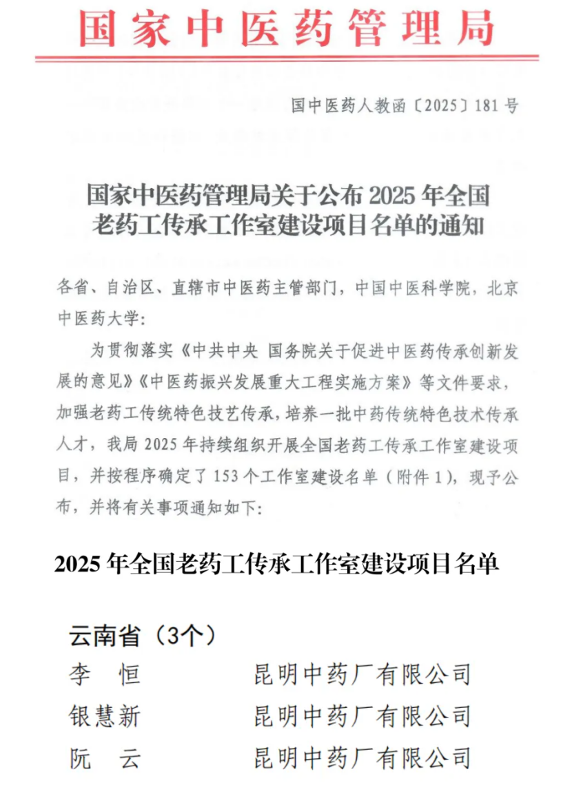 近日,國家中醫(yī)藥管理局正式公布2025年“全國老藥工傳承工作室”建設項目名單,昆中藥李恒、阮云、銀慧新三名專家成功入選。至此,包含2024年首批入選的“張元昆全國老藥工傳承工作室”,昆中藥共有四名專家...